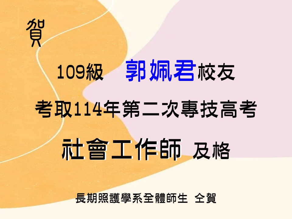 恭賀!本系 郭姵君同學 考取114年第二次專技高考社會工作師 及格