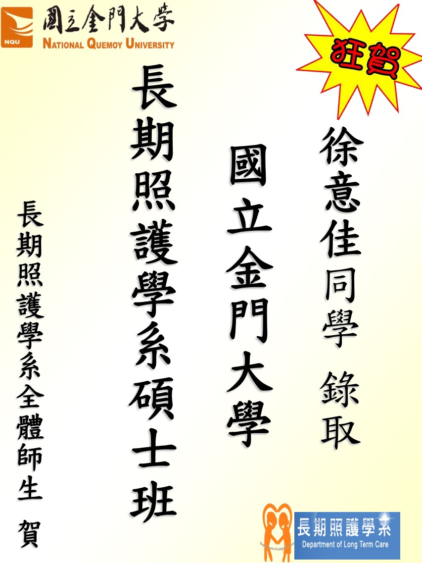徐意佳同學錄取 「國立金門大學長期照護學系碩士班」