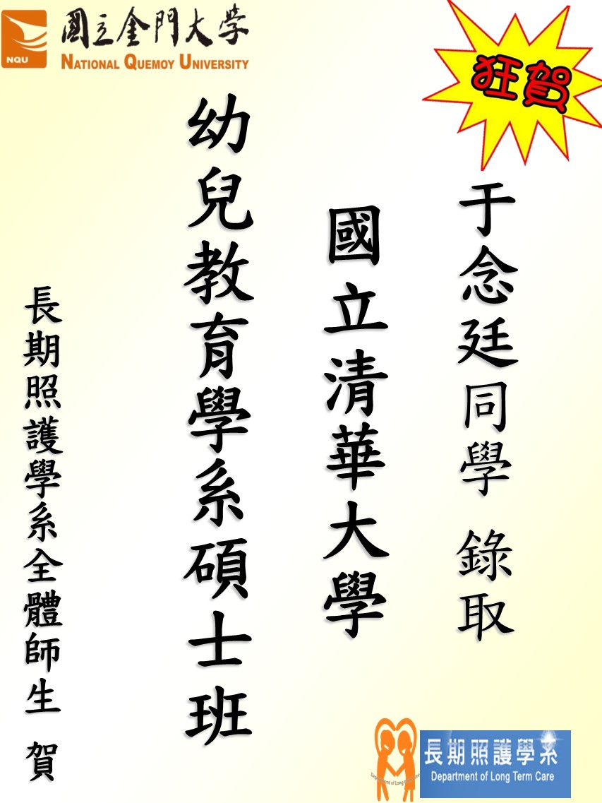 于念廷同學錄取 「國立清華大學幼兒教育學系碩士班」